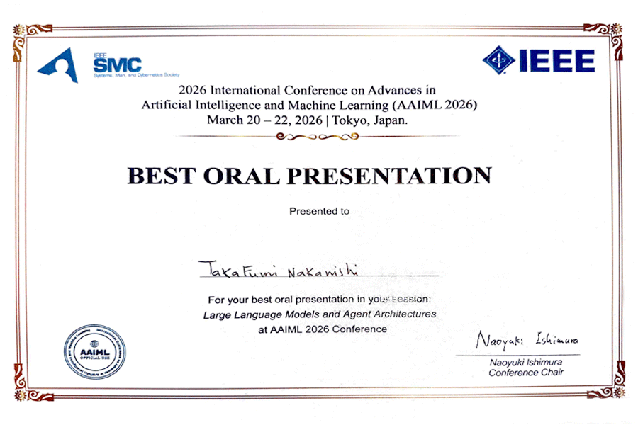 国際会議AAIML 2026にて本学コンピュータサイエンス学部 中西崇文教授が Best Oral Presentationを受賞 ― AIが研究と発信を自動化する革新的システムを発表 ―
